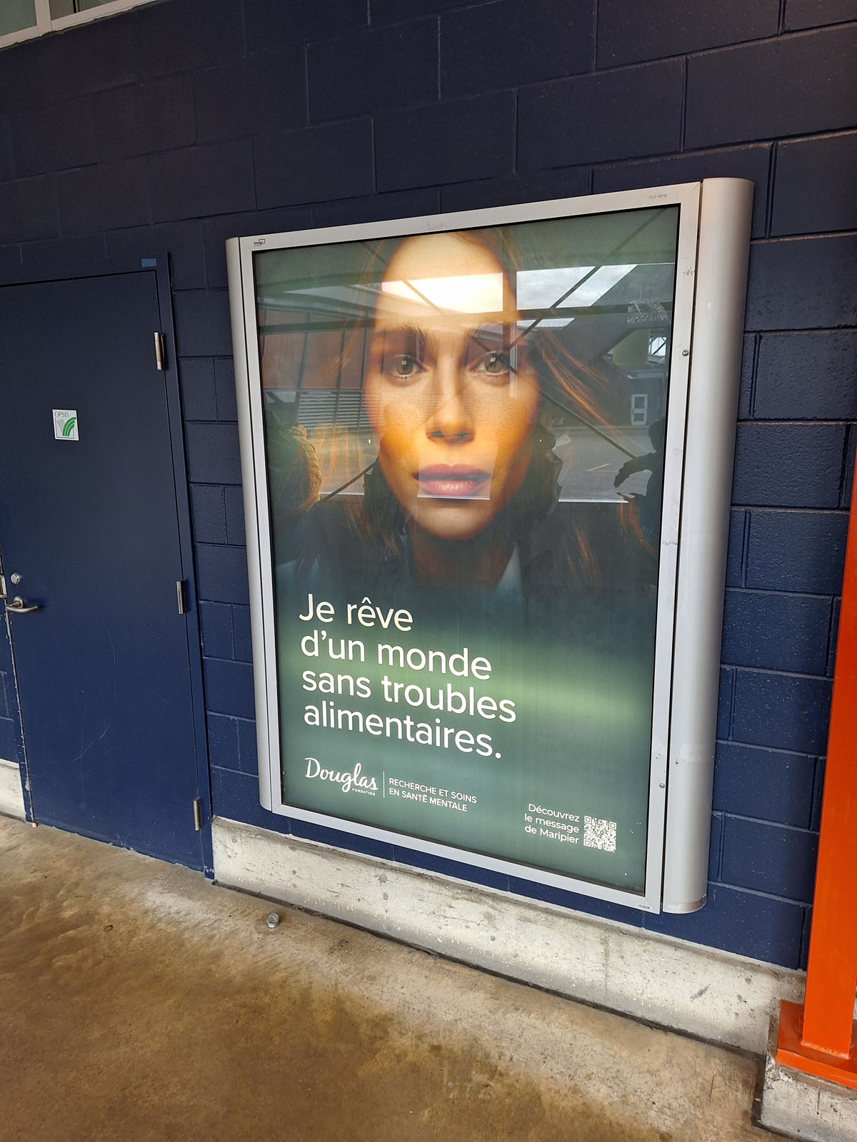 Une autre affiche identique (la même dame) dit sans Alzheimer au lieu de sans troubles alimentaires.